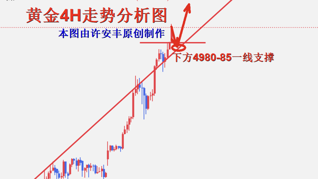 其次,没有上车的或者已经跳车的,也不追去盲目的追,虽然未来看似美好,但是如果缺乏正确的上车时机,那么风险也是巨大的!所以要等,如果今天或者本周盘面出现回调,且小级别形态见底时再去上车会相对安全很多。而当前决定短期趋势延续或转折的关键区域则是在4910这里,也就是说,在此区域之上的任何回调,都可以理解为是机会!