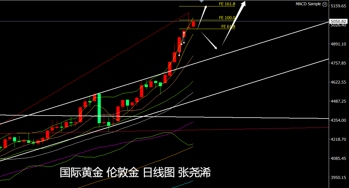 日图,金价目前虽收取倒垂看空形态,但鉴于已突破上升趋势通胀阻力,看涨前景加大,故此,如有再度回落调整,下方将依托趋势线支撑,进行再度的看涨入场。反之,如今日收线在5070美元上方,则周内将继续看涨至5160美元或更高。