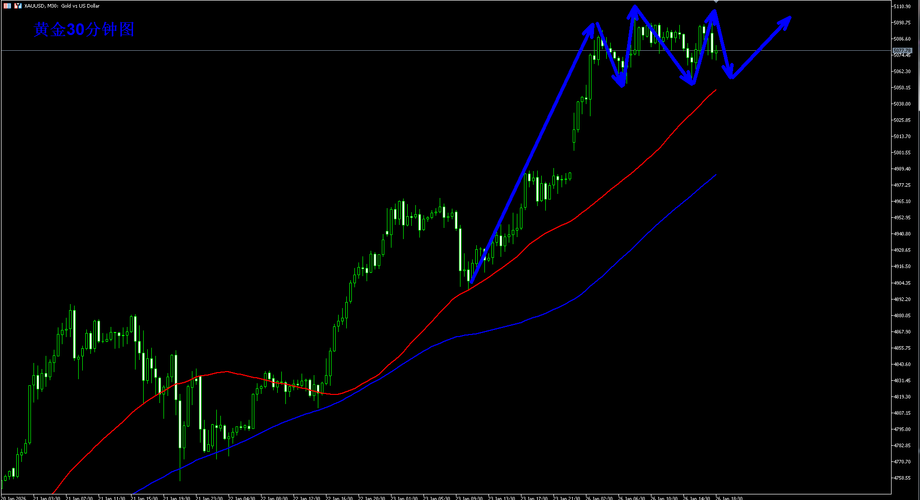 展望今日周二(1月27日):国际黄金开盘延续隔夜尾盘止跌回升之力以及逢低买盘先行走强,但日内重点关注能否收线于5070美元上方来判断后市将继续走强,反之将面临一定的调整需求。