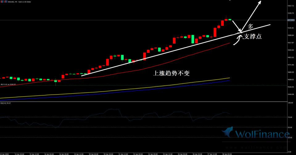 基本面,昨日的基本面美联储1月议息会议按下暂停键,维持利率在3.5-3.75%区间,米兰和沃勒支持降息25个基点。鲍威尔重申利率处于中性区间上端,政策没有预定路线,用数据说话,并表示如果关税通胀触顶后回落,即表明可以放松政策,建议继任者远离政治。美财长贝森特表示没看过总统可能在一周左右公布美联储主席人选。另外,美国总统表达不担忧美元走弱后,贝森特表示,美国长期奉行强势美元政策,绝对没有干预日元。而美国总统再次警告对伊朗下一次袭击将更严重,称后者时间不多了。伊朗常驻联合国代表团回应称,伊方愿在相互尊重基础上与美对话。避险情绪下,金银冲破多重技术压力再创新高,但技术超买已经非常严重,做多是趋势,但获利了结行情也将随时发生。今日的基本面主要关注21:30的美国至1月24日当周初请失业金人数和美国11月贸易帐,随后看23:00的美国11月工厂订单月率和美国11月批发销售月率和美国11月耐用品订单月率。