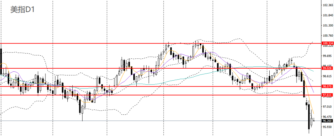 美元指数昨日收阳,今日亚盘延续跌势,4小时仍承压于97下方,短线预计将维持低位震荡,下方继续关注95.50-95.60一带支撑。