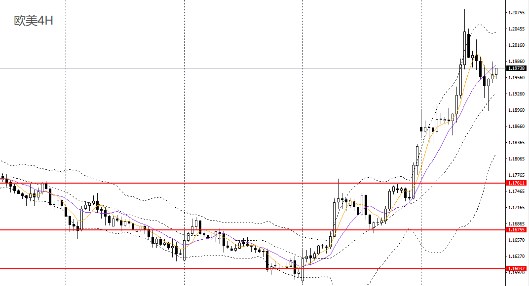 欧美周三高位回落,徘徊于日线布林上轨附近,日线RSI走低,4小时一度刺破1.19关口,短线趋势转弱,如维稳于1.19上方可维持多头思路。