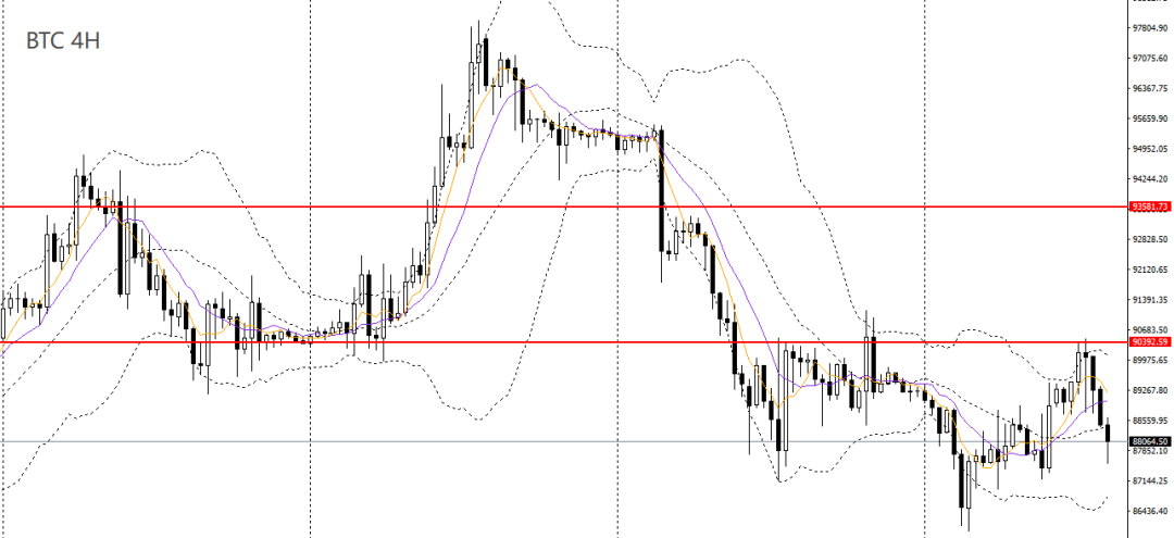 比特币收倒锤阳线,仍徘徊于5日、10日均线附近,日线RSI位于50之下,4小时未能有效上破90000附近压力,短线趋势再度转弱,后市不排除将下探84000-86000一带。