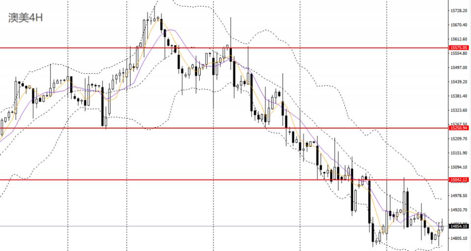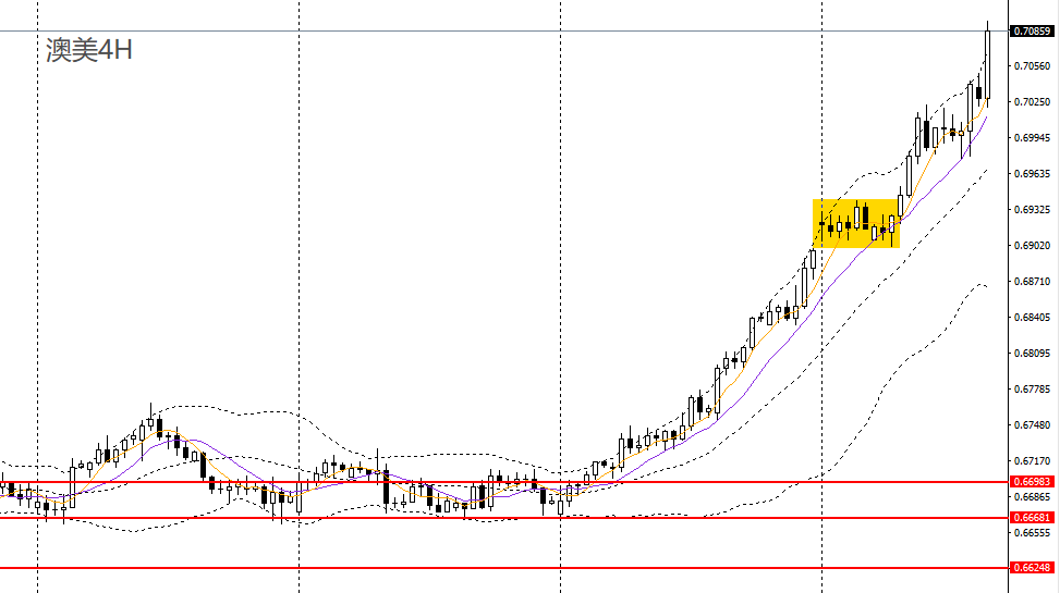 澳美继续沿日线布林上轨走高,日线RSI到达超买区,4小时站上0.70关口压力,0.7050一线不破可继续做多,后市预计将挑战0.71。