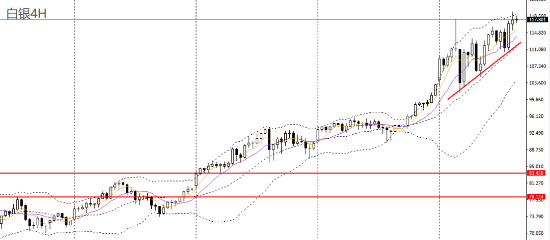 白银昨日再收长阳柱,今日亚盘刺破前高,日线RSI仍位于超买区,4小时呈空中加油,多单可继续持有,后市有望再度升破119。