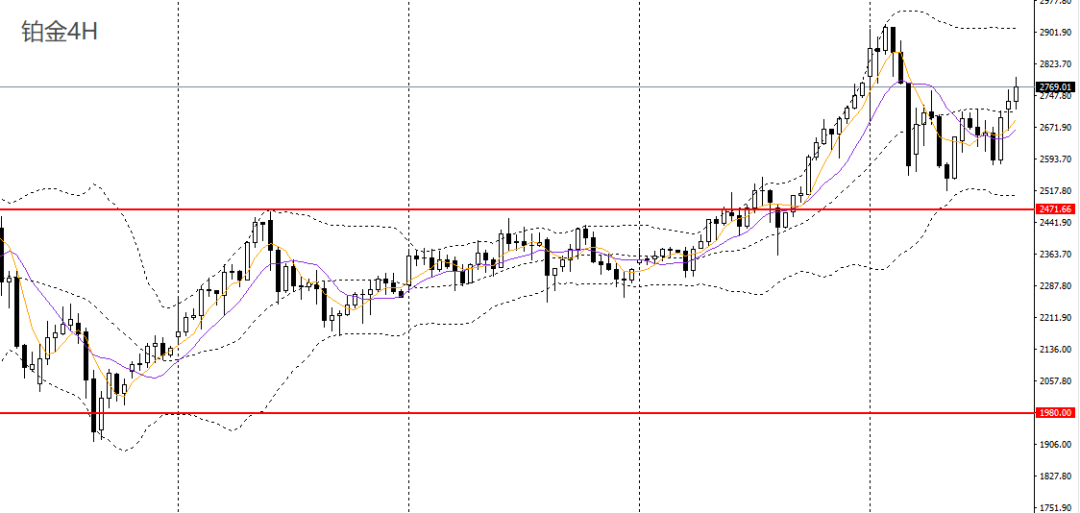 铂金延续上行,仍立于5日均线上方,4小时呈头肩底,整体趋势偏多,多单仍可持有,上方关注2780-2800压力带,如无法升破,多单可暂时离场。