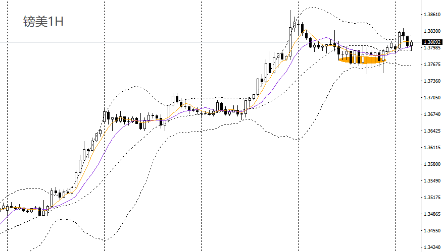 镑美周三收锤子阴线,未破前高,日线RSI仍位于高位,4小时呈圆弧底,1.3750-1.3760一带存在较强支撑,如回踩至支撑带附近企稳可继续进多。