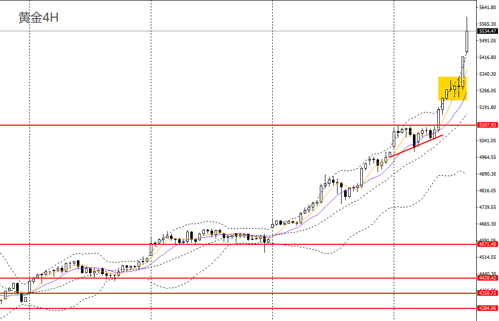 黄金持续破高,强势站上日线布林上轨,日线RSI到达极值,4小时升破5300平台阻力,走势极为强劲,5500附近企稳可进多。黄金/人民币如于1220一线企稳可进多。