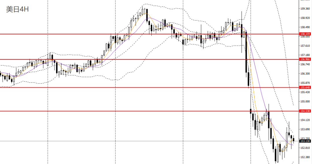 美日日线呈平头底部,仍承压于5日均线,4小时于154关口遇阻回落,整体趋势仍偏空,如继续承压于154下方,空单可持有,短线有望再度回踩前低。