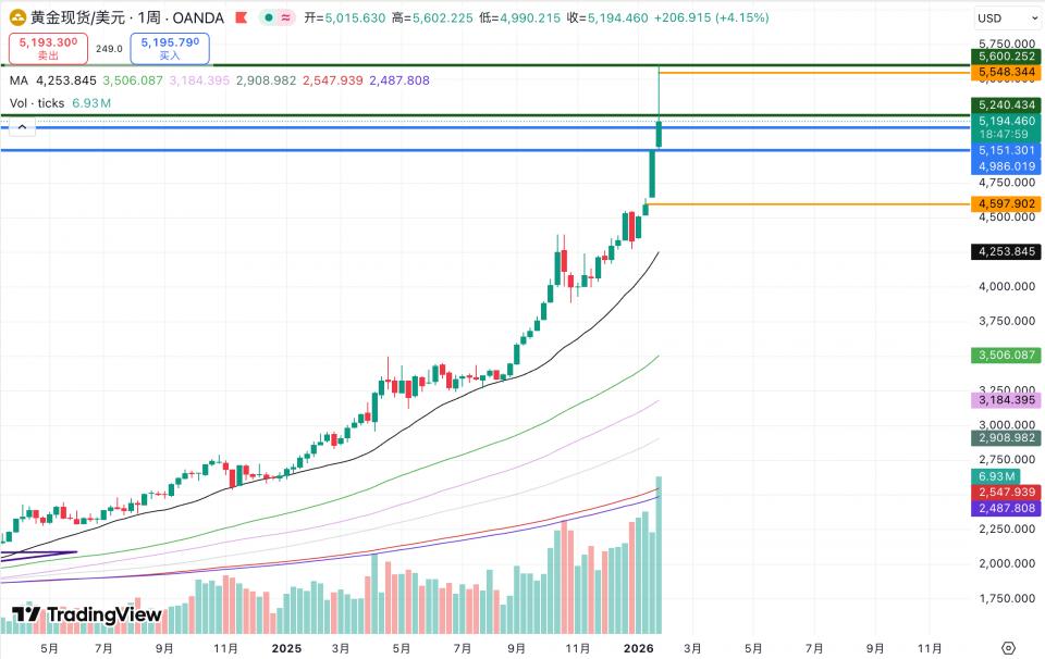 这根周线K线幅度大、走势强劲且极具冲击力。当黄金进入这种趋势阶段时,它有时会做出令大多数参与者最不安的事情:它会形成另一根同样大小的周线K线,直接突破阻力位,并引发全面价格重估。如果这种情况发生,讨论的焦点很快就会从“技术性上限”转移到新的市场格局。
