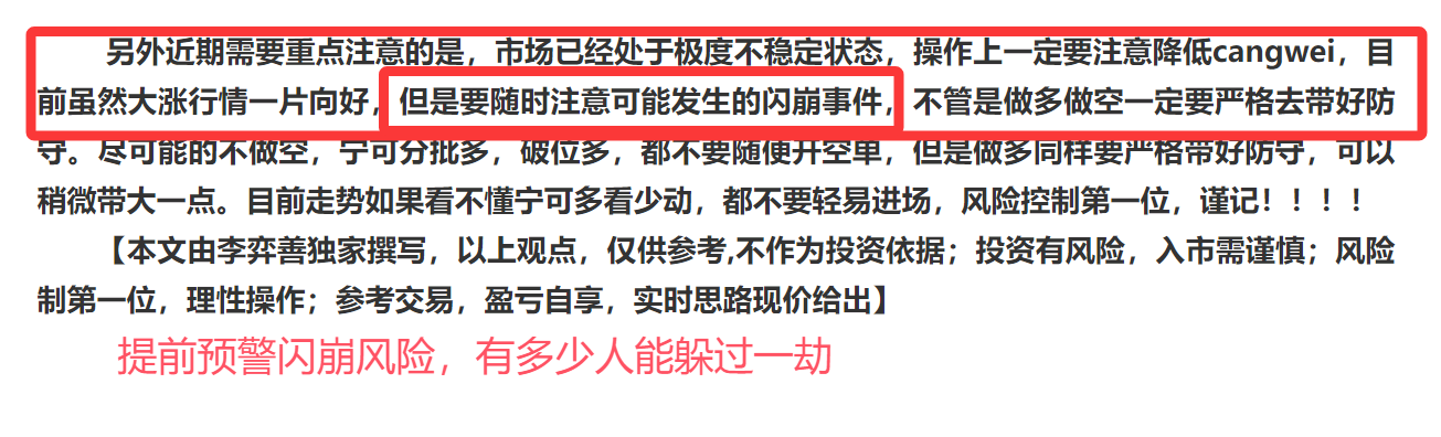 说实话,本周的市场根本就不适合散户去参与,每天涨100霉,除非是真能按照我周三给的思路“破位直接跟多,只要出了新高直接进,并且采取guncang思路,不断加多看新高”这种手法去参与有机会吃到肉。普通散户即使偶尔参与几次多单也难以拿到较大空间,拉升往往在你猝不及防之间。而本周的另外一个关键就是——风险控制! 一定要学会及时停止,及时收手! 本周的情况不管你之前做多收了多少,如果没有做好风控,昨天一波行情可能就直接打到解放前,甚至直接拉爆也不是没可能。一分钟可能出现超100个点波动,这个走势根本没有参与空间,这也是为什么我近一周很少给具体策略的原因。 说实话这行情我看着都怕,前无古人,闻所未闻,在这种情况下你停止操作可能已经超过90%的人!