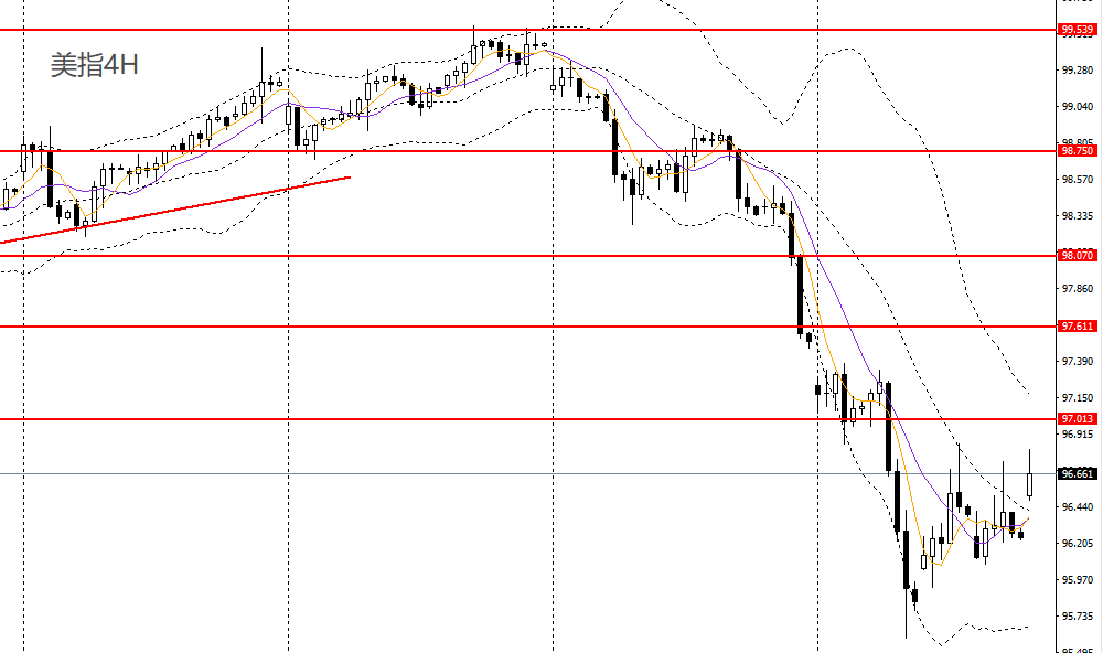 美元指数昨日收十字星,今日亚盘小幅反弹,4小时守住96关口,短线预计将上探96.80-97。