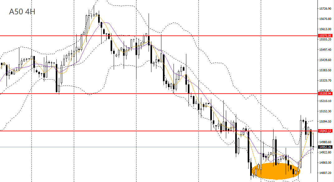 A50日线呈平头底部,上探10日均线,4小时触及15000关口阻力,如出现有效上破,后市预计将继续挑战15200附近。