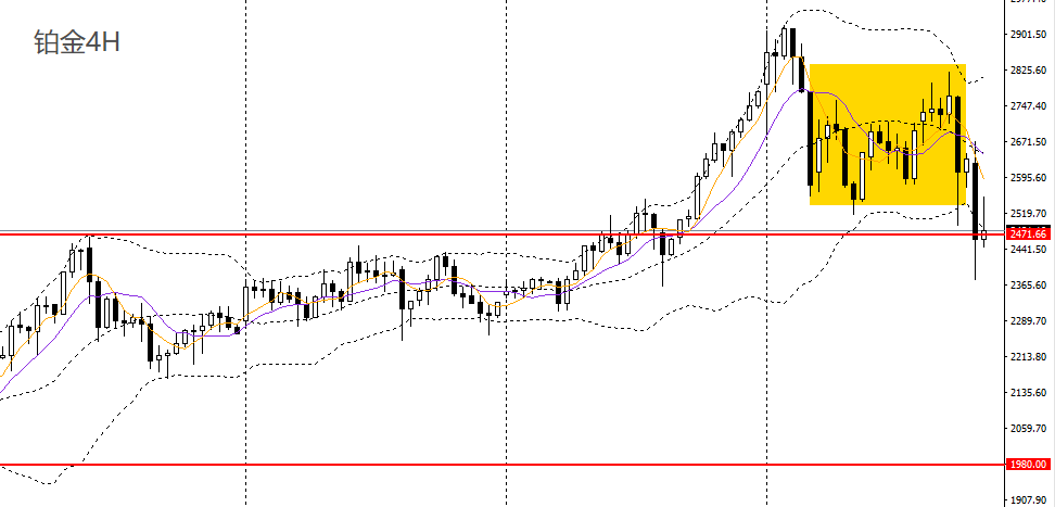 铂金昨日阴跌,4小时失守关键支撑2470,且打破近期区间震荡格局,短线趋势转弱,2600一线承压可进空。