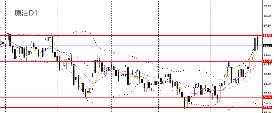 美原油日线呈前进三兵,上破布林上轨,4小时刺破66大关,短线走势极为强劲,但高位谨慎追多,如于63附近企稳可做多。