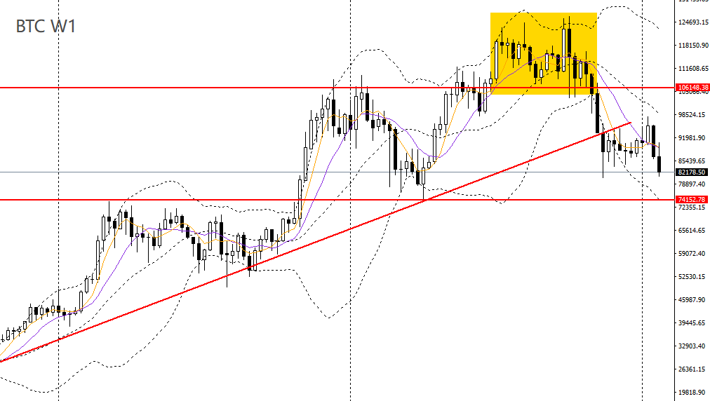 比特币深度下挫,逼近前低,日线RSI到达低位,4小时失守84000-86000一带支撑,下方首先关注80000关口,如正式下破,可继续看空至75000。