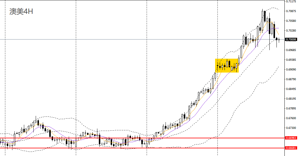 澳美刺破前高,0.71关口面临强压,日线RSI自高位回落,多头动能减弱,多单建议离场,0.7020一线承压可择机做空。