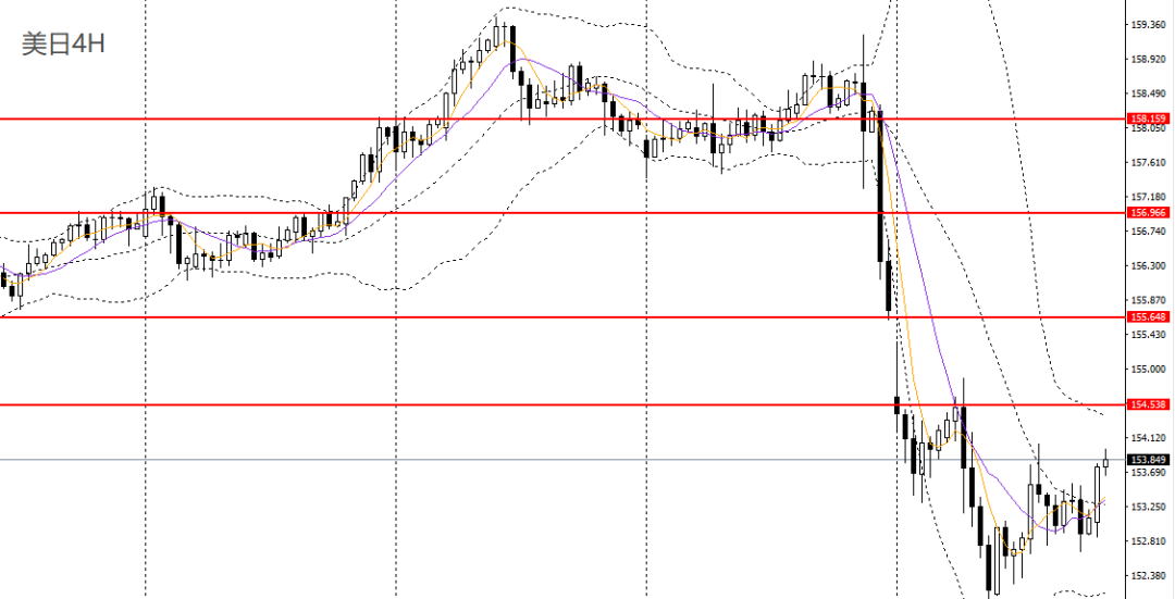 美日昨日小幅收跌,今日亚盘强势反弹,重回日线布林下轨上方,4小时呈头肩底,153关口附近为下方关键支撑,如回踩153.30一线企稳可进多。