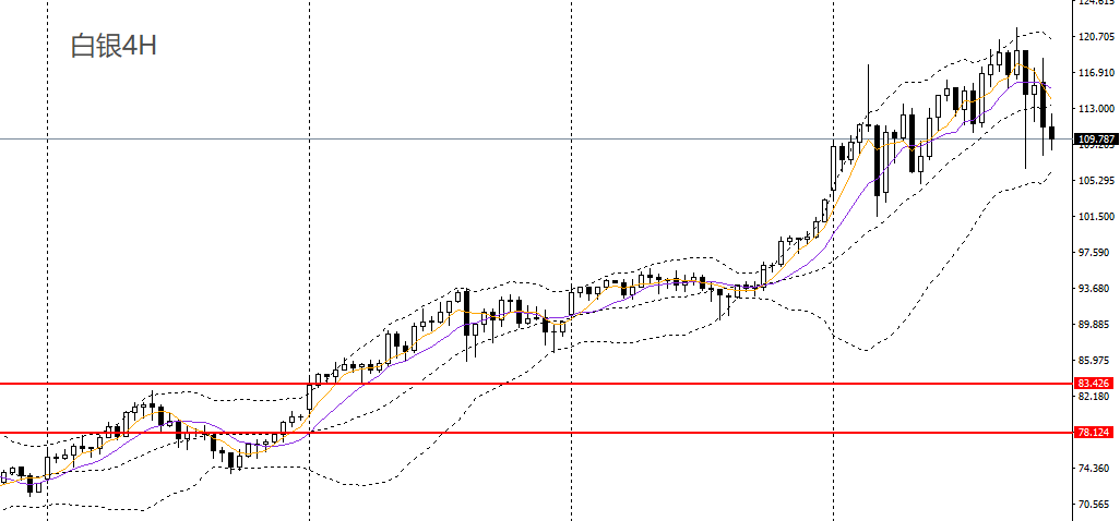 白银昨日收十字阴线,今日大幅走低,4小时呈头肩顶,如于115附近承压可继续进空,短线有望回踩106一线。