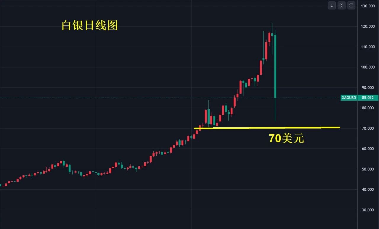 白银从120美元一日跌回一个月的涨幅,没有及时离场或兑现利润都将可能面临被短期套牢风险,白银强支撑在70美元附近,上周五暴跌后短期仍有反弹,但只是反弹而已。