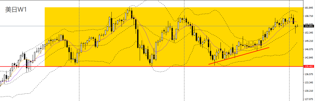 美日上周收十字星,RSI跌至50附近,波段预计将维持区间震荡格局。周五收长阳柱,日线RSI延续回升,4小时一举站上154.50附近阻力,上行空间打开,多单仍可持有,后市大概率将挑战155.60。