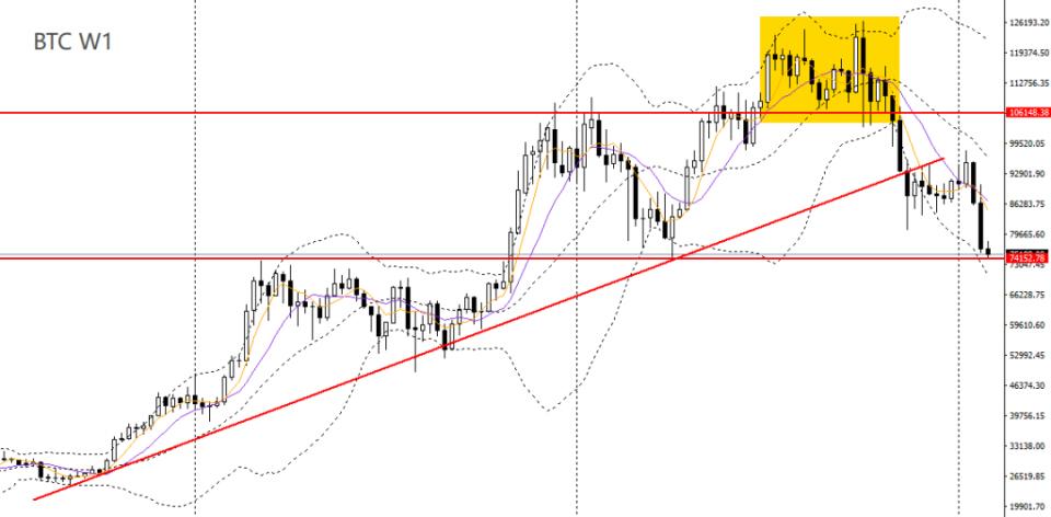 比特币上周延续阴跌,RSI到达低位,波段趋势再度转弱。昨日小幅回落,今日亚盘继续下行,创9个月新低,日线RSI接近超卖区,如正式下破75000,短线可继续看空至70000。