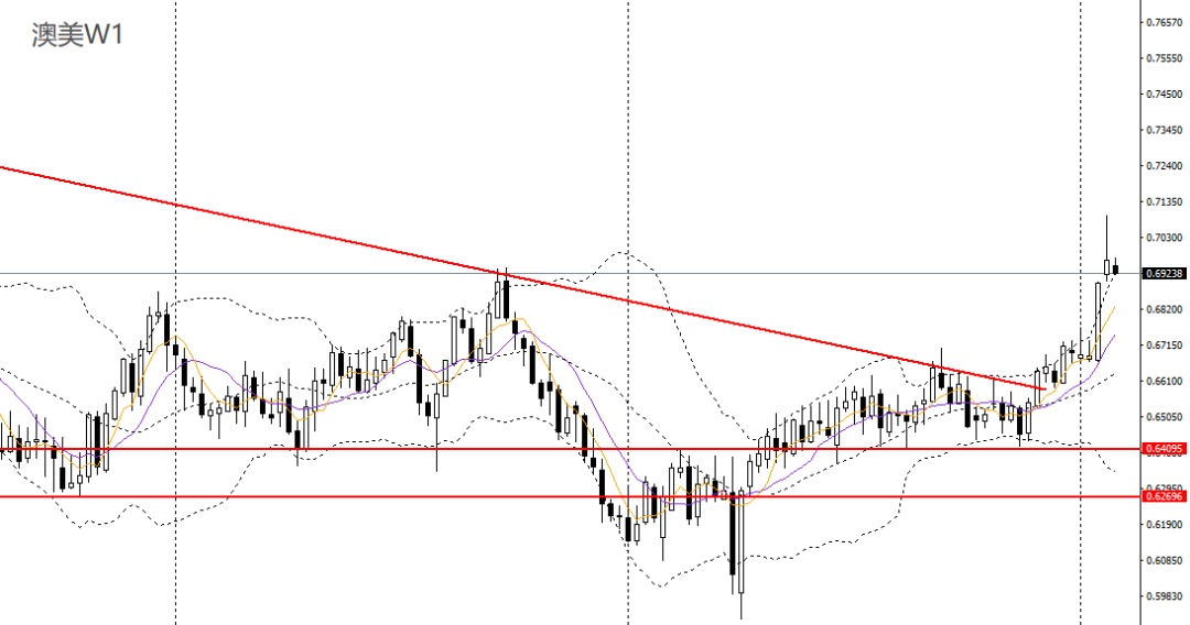 澳美上周收倒锤阳线,仍立于周线布林上轨上方,波段预计将延续上行。日线呈黄昏星,4小时呈头肩顶,空单可继续持有,后市有望回踩0.69关口附近。