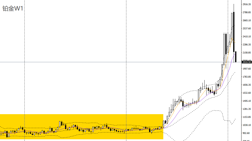 铂金周线呈看跌吞没阳柱,失守10周均线,波段预计将延续回落。周五收长阴柱,刺破日线布林下轨,2160-2180一带承压可进空。