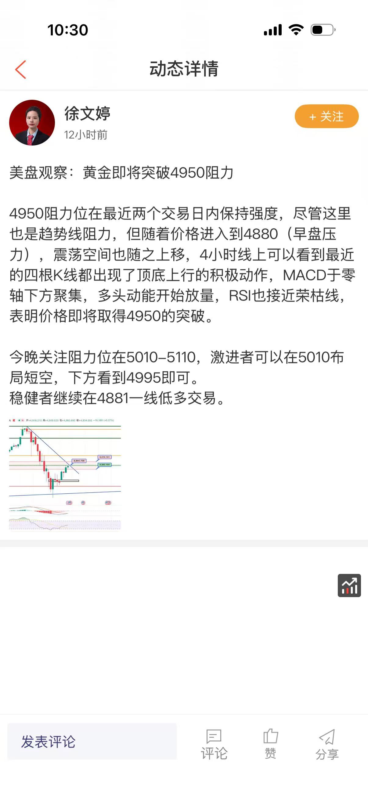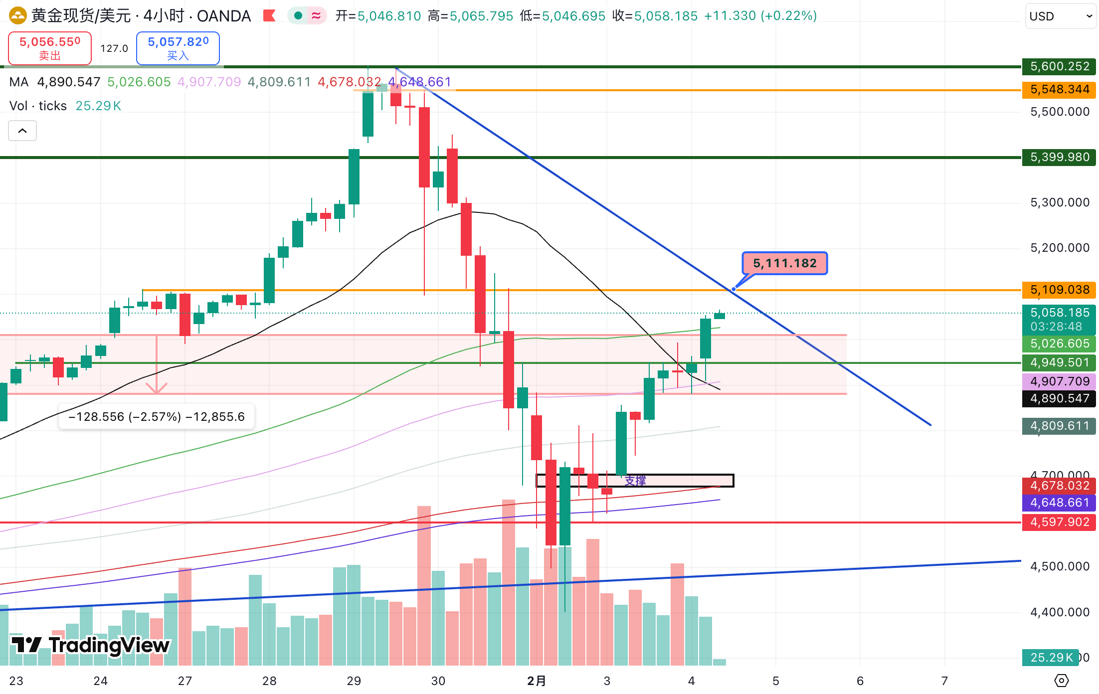 一如我们昨晚的预期,黄金价格突破4950…(下图)。今天(2月4日)早盘再接再厉,高点触及5065.7,距离上方压力5111(同时也是趋势线阻力)只有一步之遥(5111曾在1月26-27日两天保持阻力)。