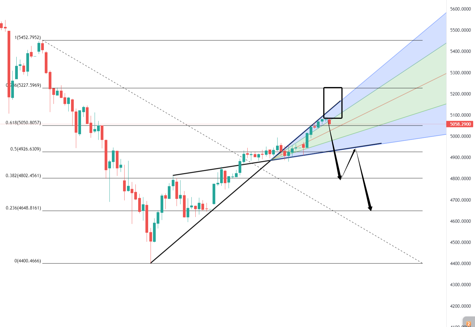 昨天的交易方针是,即便我也很想去寻求调整高点,但奈何于行情的波动太大,1000美金之后的补涨,贸然去定义高点的话,摸到还好,没摸到就会很容易上头造成大亏损,既然已经意识到它转为了调整上涨,那干脆就顺这个方向去买涨,多少还能赚点,等5000目标达到后出局,再去考虑下一步交易动作,最好是能见到转跌,这样还能去尝试一下看跌机会,可最后没什么转跌动作,早上直接涨破了5000.