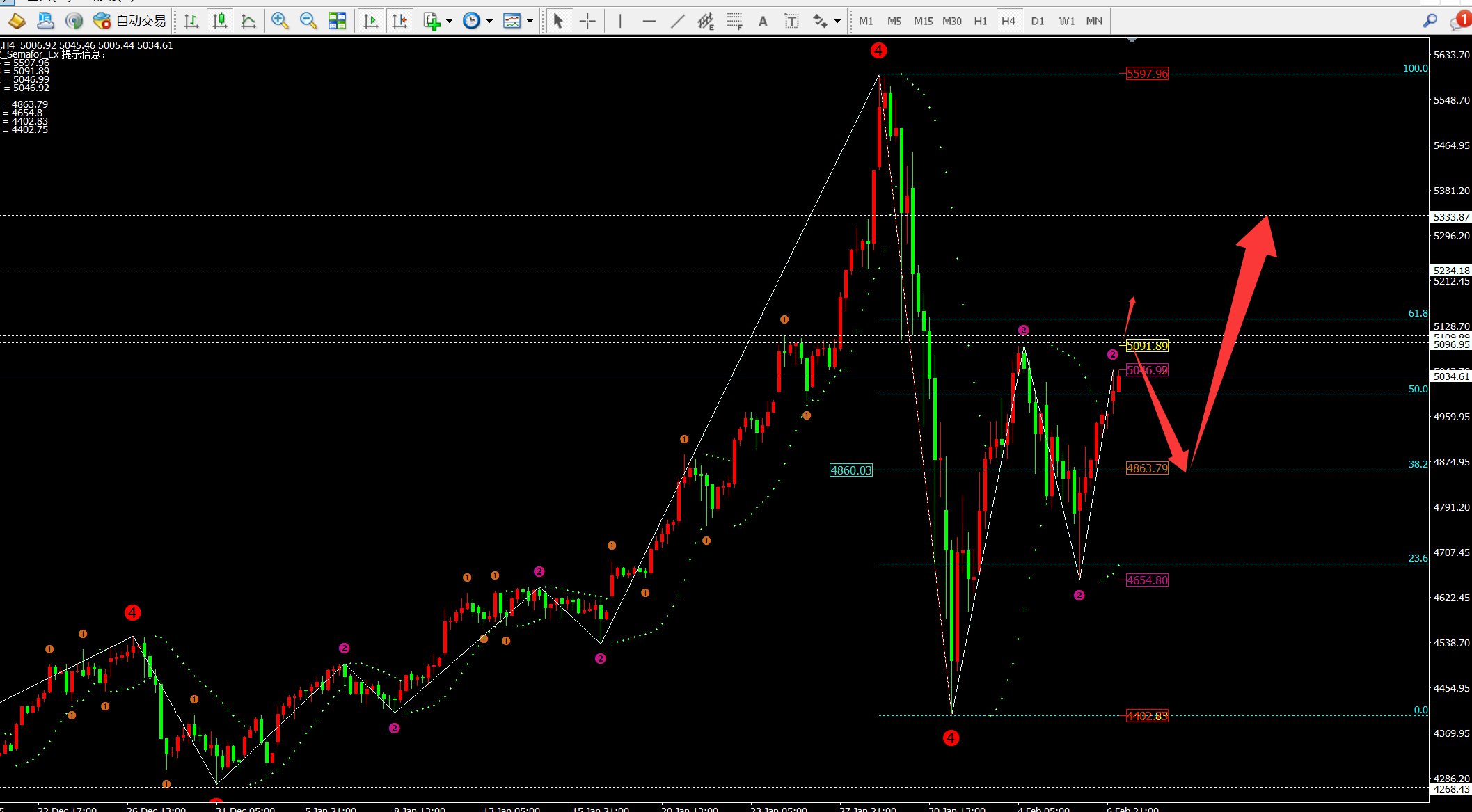 ② 日线上周五以带有下影线的光头阳柱收尾,代表今日价格将继续冲高。因此我们日内需要找位置布局多单。当然上方关注点就是上周高点5092一线,而下方支撑位于中轨附近均线MA5附近对应4936-4890一线。因此今日布局多单位置在4890上方,也就是4900较为合适。从日线的斐波拉契回调线看目前支撑4936-4956区间。