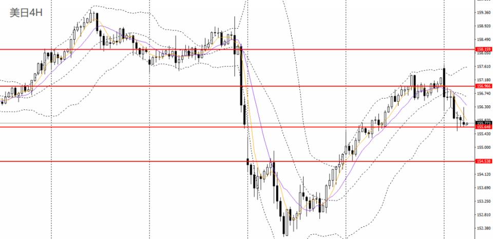 美日周一收看跌吞没阴柱,日线RSI跌破50,4小时回踩155.60一线支撑,短线趋势转弱,如于156关口附近承压可进空。