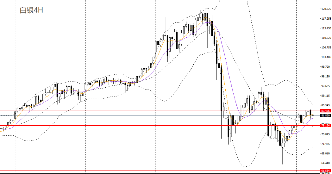白银昨日跳空上行,4小时触及83附近压力,多单仍可持有,如出现有效升破,后市可继续看多至86。