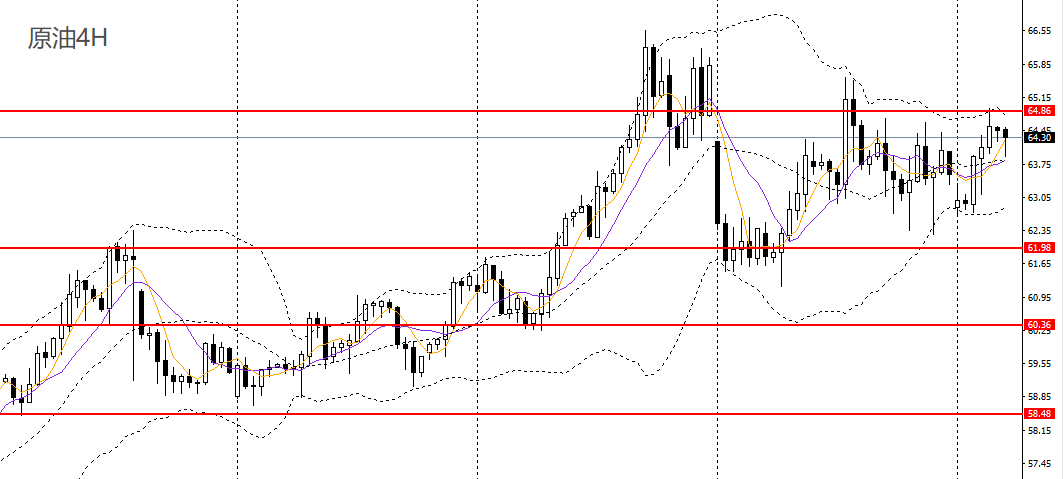 美原油昨日大幅回升,升破5日均线,4小时逼近65关口阻力,但未能有效上破,短线大概率将维持震荡格局,可保持观望。