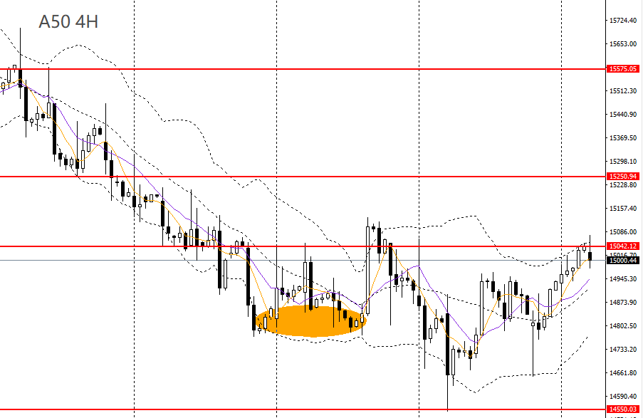 A50昨日继续拉升,立于5日均线上方,4小时刺破15000关口,此处仍为关键节点,如彻底,后市可看多至15200。