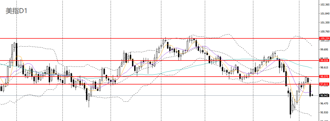 美元指数收长阴柱,跌破1周以来新低,4小时失守97关口支撑,如继续承压于下方,短线可看空至96.60一线。
