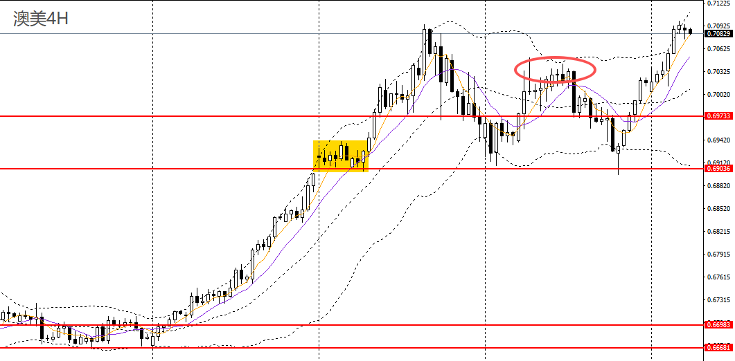 澳美刺破前高,日线RSI到达高位,0.7030-0.7040成为下方关键支撑,如维稳于上方可继续进多,上方首先关注0.71关口压力,如彻底升破,可看多至0.7120。