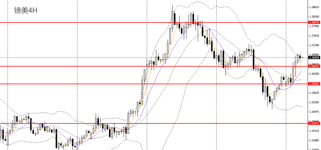 镑美昨日再收长阳柱,站上5日均线,1.3650一线成为下方关键支撑,支撑位上方仍以看多为主,如出现回踩企稳可继续进多,短线可上看至1.37,1.3730。