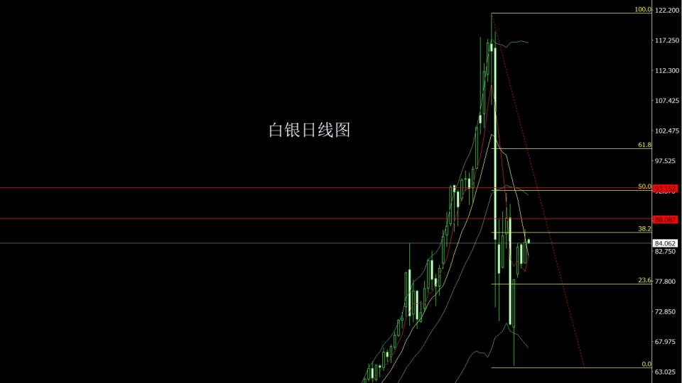 白银市场昨日开盘在80.735的位置后行情直接拉升,日线最高触及到了86.349的位置后整理,日线最终收线在了84.244的位置后,日线以一根上影线很长的中阳线收线,而这样的形态收尾后,今日81.6多止损81.2目标看83和83.5和84-84.5和85.