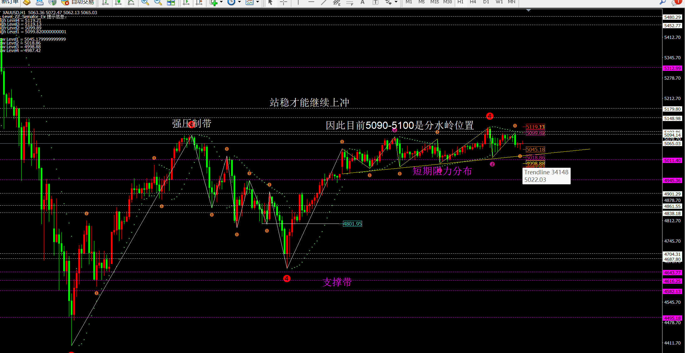 综合而言:黄金价格短期维持震荡,但是日线级别是震荡反弹走势。所以目前关注5040一线支撑和4980一线。而上方关注5100以及5180附近的压制
