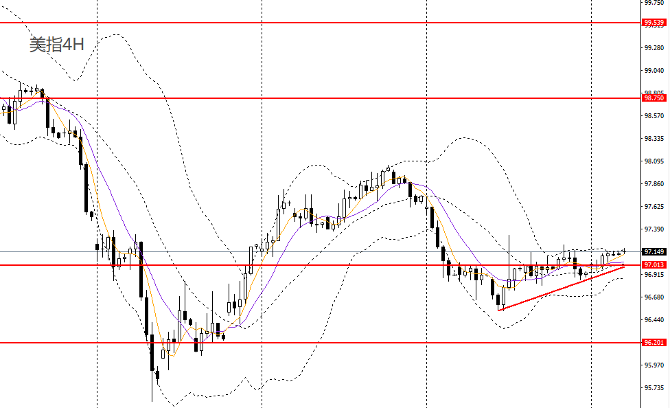美元指数周一收小阳线,上破5日均线,日线RSI小幅回升,4小时站上97关口,但多头动能仍有限,短线震荡的概率仍较高。