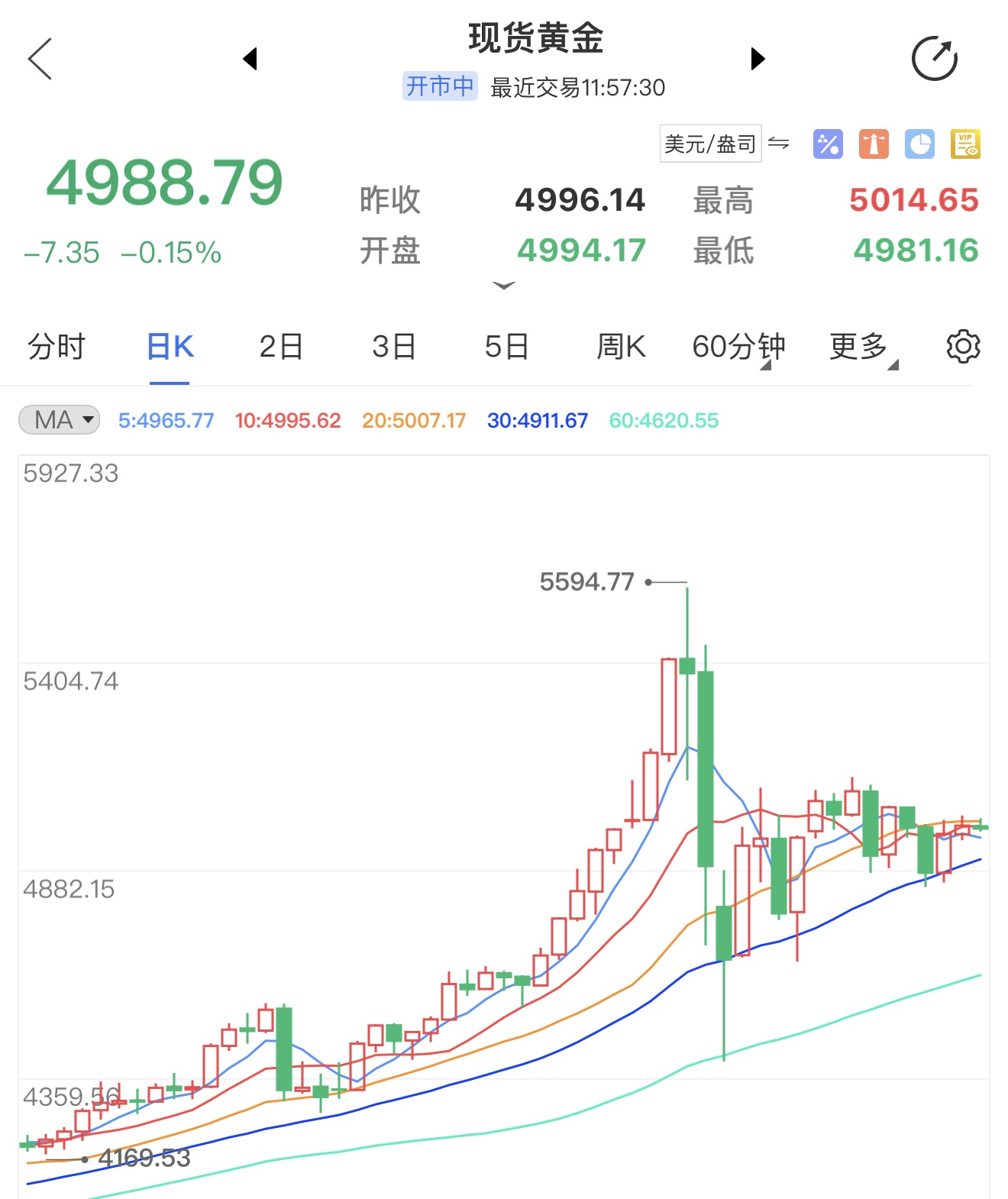 当前金价4990,日线收两连阳,在20日均线附近震荡整理,整体上行结构非常健康。