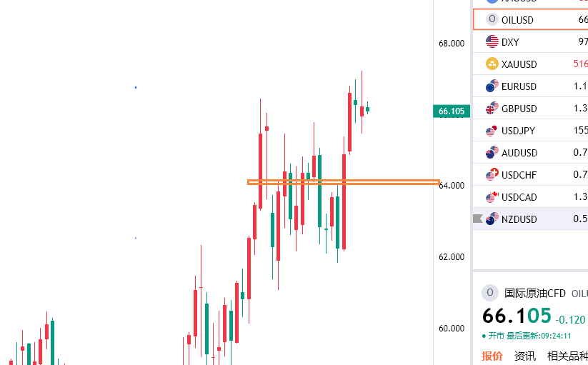 原油初见67附近空,防守67.8,目标看65附近,回踩64.2附近多,防守63.4,目标看66上方