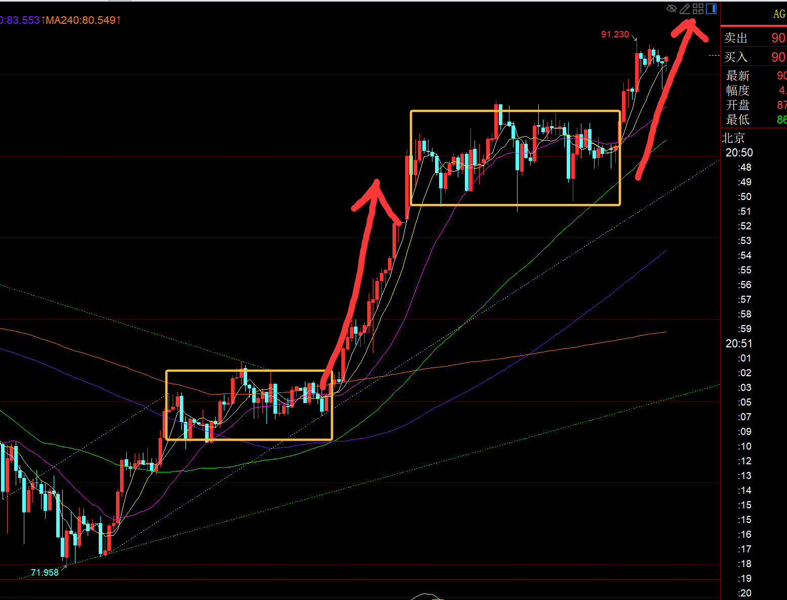 第二,白银日线单边形态更明显些,连阳小阴,今日继续阳线破高;昨日小阴回踩确认中轨,修正之后继续拉高;后续只要稳住86,会持续拉升,关注92-93前高,一旦突破站上,则指向100关口; 今日亚盘也是持续拉升一波,欧盘小幅回踩确认顶底支撑89上,企稳继续拉升;