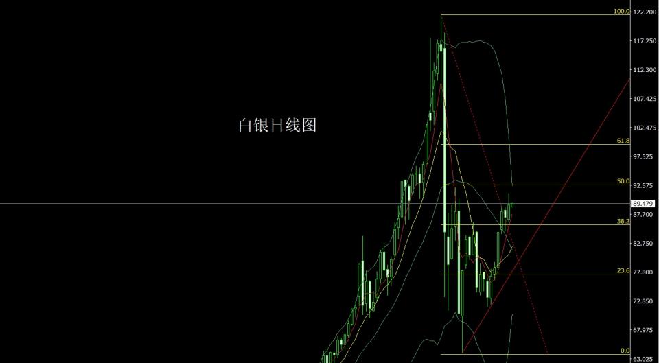 白银市场昨日开盘在86.757的位置后行情先回落给出86.223的位置后行情强势拉升,日线最高触及到了91.313的位置后行情尾盘回落,日线最终收线在了89.208的位置后,日线以一根上影线很长的大阳线收线,而这样的形态收尾后,今日的行情87多止损86.7,目标看88和88.6和89和90和91.