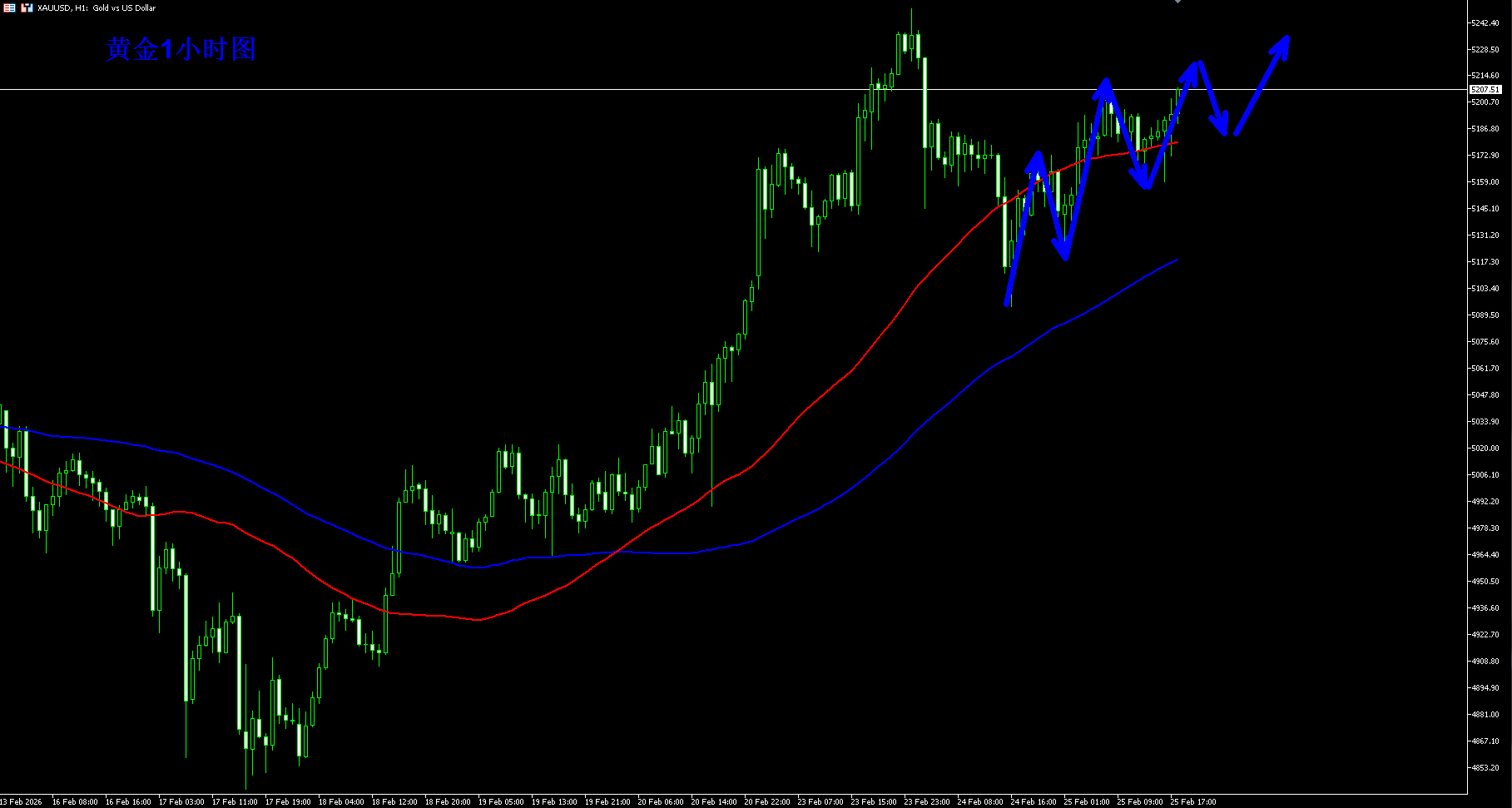 从黄金 30 分钟 K 线图来看,价格在前期冲高至 5250 附近后进入回调,目前围绕 5190.80 这一关键水平展开争夺。这一位置既是前期震荡区间的上沿,也是多空双方的心理分水岭:
