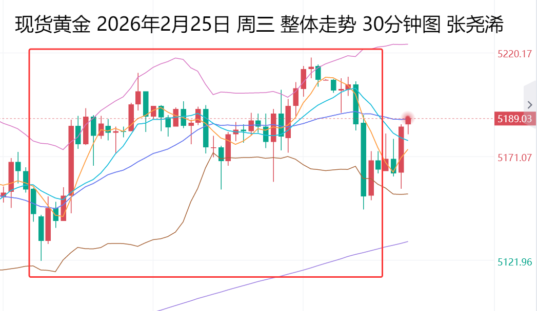 近期由于美国关税风波在全球引发巨大关注,因为这跟所有国家息息相关,先是美最高法院裁定美之前超高关税不合法,会面临退税的局面,而巨大的税务问题可能会让美政府再度停摆甚至影响到经济发展,而后特朗普也是继续对全球贸易国家加征10%甚至15%的关税,多变的局面让市场避险情绪以及不确定性发酵到了顶点,一方面避险买入,一方面不确定性高位获利离场,造就了短期黄金反复震荡的走势,上个交易日黄金早盘从5125附近一路震荡反弹,早盘直接突破周二晚间反弹的高点一度触及5193附近然后维持窄幅整理,欧盘走出一波快速冲高到5210一线然后回落,我们跟大家分享的5190附近空多次兑现20多点空间,破位多也小有收获,但是需要及时进出,美盘前后回踩5155附近二次拉高到5217附近,我们晚间跟大家分享的5168附近多也是兑现到了5200上方目标位,日内明显的区间思路先执行即可,关注今天美伊谈判的情况。