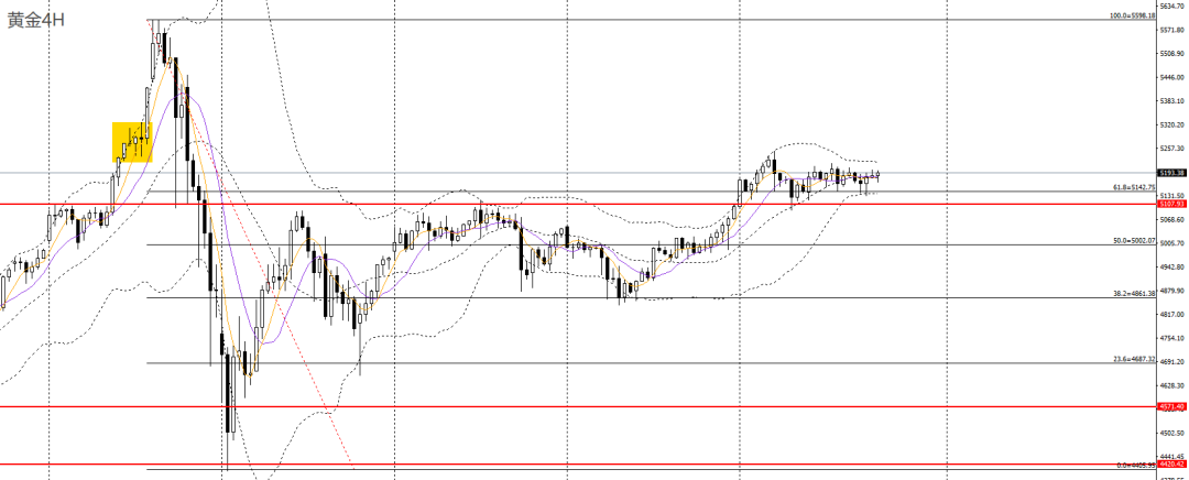 另外一个再看盘面结构,日线中长期看涨的趋势没有改变,四小时此前我们说突破5100美元之后,新的底部结构确立,其对应的上方高点保守会去到5300或5400一线,我说的是保守去到这一区域,而且有可能会更高!