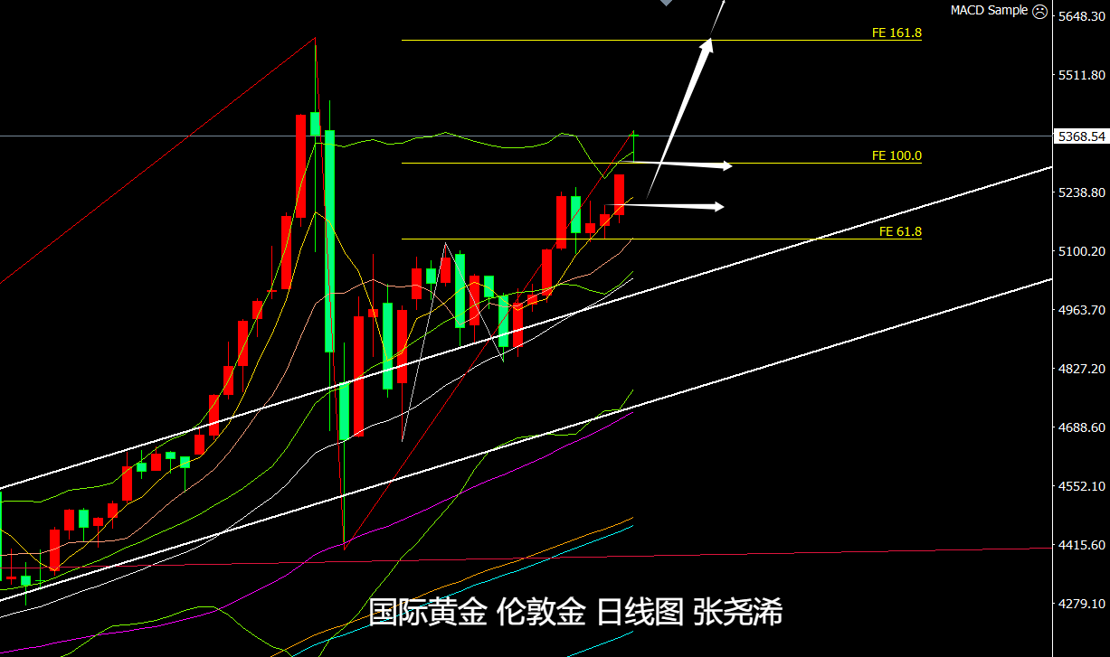 黄金市场上周:国际黄金延续前周触底回升之力,再度走强收阳,也如期触及给出的扩展线目标位,目前多头动力持稳,基本面偏向利好,技术前景维持多头,后市将有望再度上探历史高点。