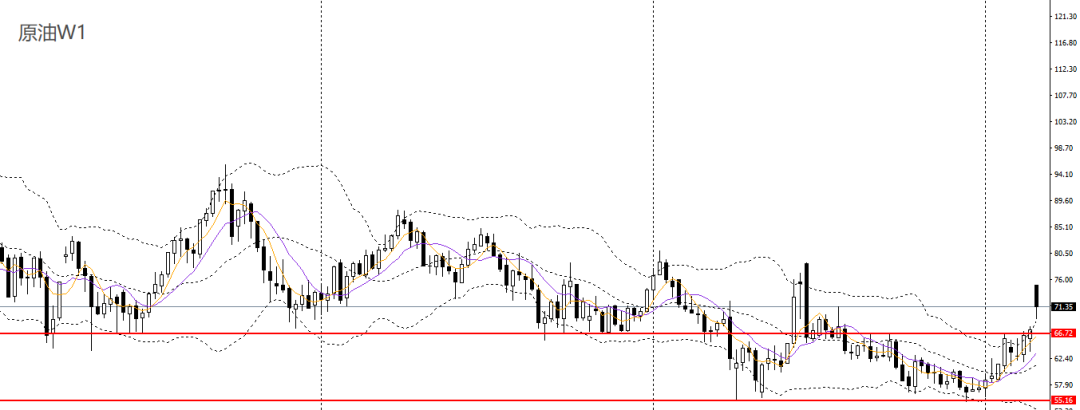美原油上周收涨,5周、10周均线呈多头排列,波段有望延续反弹。周五大幅拉涨,周一亚盘跳空走高6美金,4小时升破此前震荡区间上沿,上行空间打开,短线趋势强劲,如回踩69附近企稳可进多。